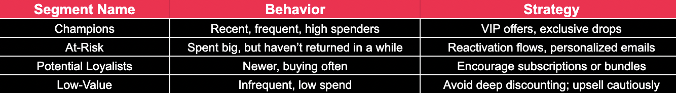 Bucket Tier 1–3: High Recency + Frequency + Value → Priority targeting.